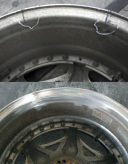 溶接跡、溶接団子に再クラックが入っています。溶接も研磨もかなり雑です。インナーリムクラックの修正は一部まじめにやっているお店以外はほとんどこんな感じでただ溶接しただけです。こんな修理なら5分もかかりません。 |